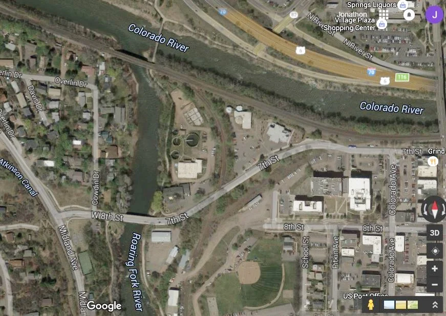 The Confluence area referred to on this website, is the crescent shaped piece of land bordered by the Roaring Fork River on the West side, the Funeral Home and 7th Street on the South, the Eastern and Northern perimeters are an 18 foot railway embankment that wraps around and runs the full length of the site.